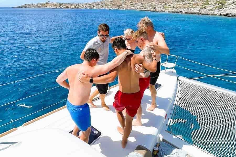 Entdecke Balos und Gramvousa an Bord eines Katamarans – schwimme, sonne dich, genieße köstliches lokales Essen und erfrischende Getränke, hab Spaß mit unserem Entertainer an Bord und entspanne dich mit einem kostenlosen Transfer.